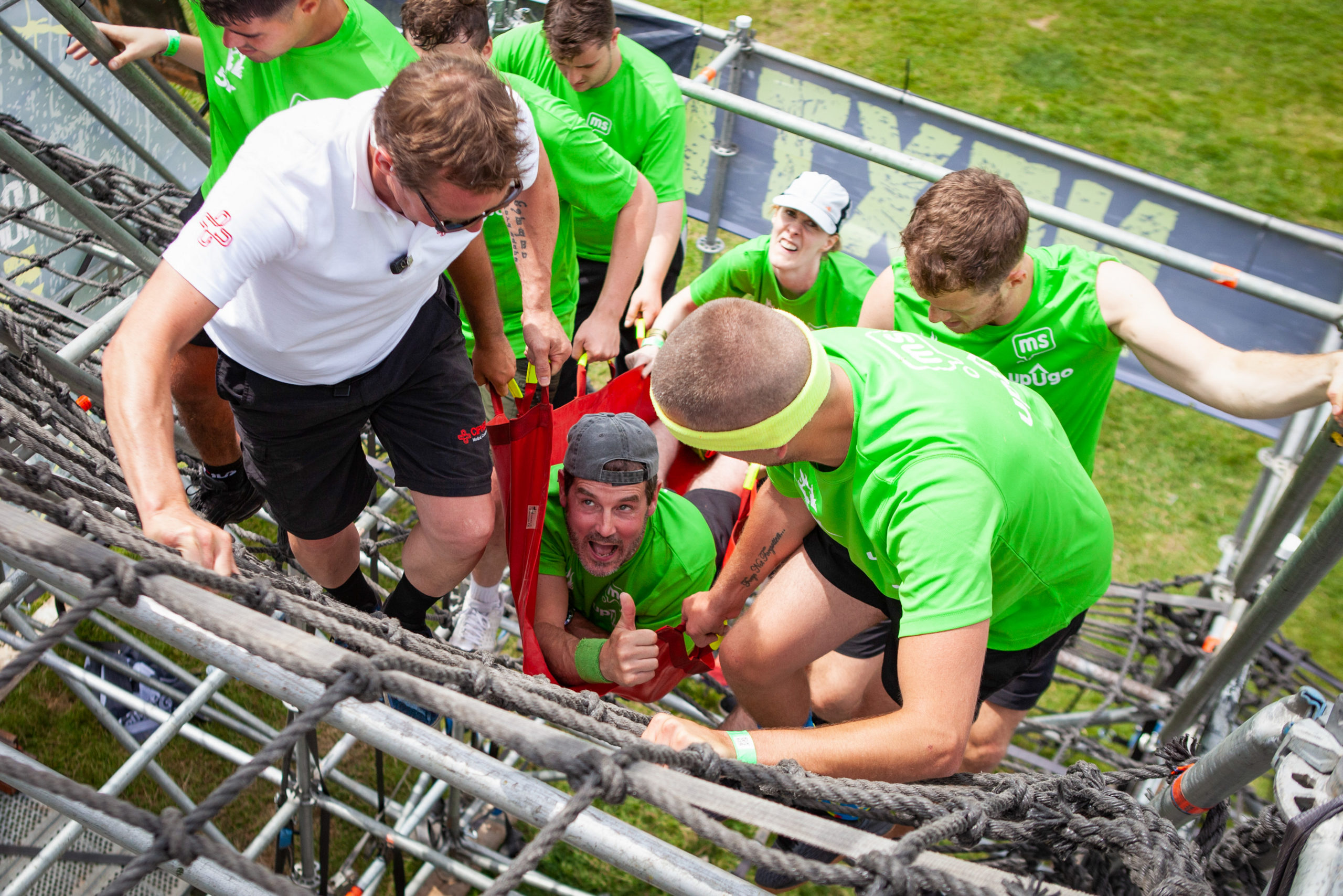 Unfortunately, Mark has many of the symptoms of MS, including very limited use of his lower limbs. However, this didn’t stop him from getting around the Tough Mudder 5K Urban course and taking on every single obstacle in his wheelchair, with the help of his team.
